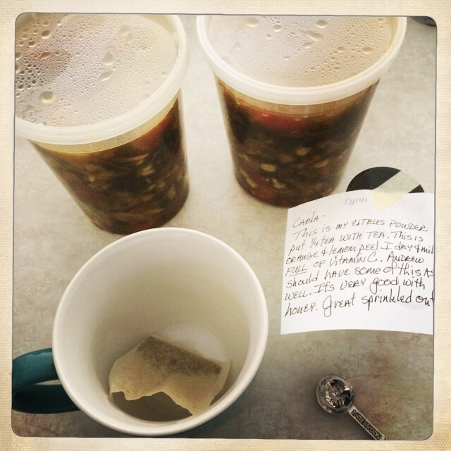 My grandma is no longer alive, and my mom is thousands of miles away, and I’m not a kid anymore, but I guess whenever I get sick I still get nostalgic for that time and long for that comfort. But now my husband is the one making my cinnamon toast (he does a pretty good job, though he will claim that he doesn’t know what he’s doing), and a dear friend delivered to my door homemade chicken and vegetable soup (it was amazing!), samples of her favorite tea, a pack of saltines, and orange and lemon peel that she milled herself and recommended adding to my tea. These are simple, little things that  warm this sick girl’s heart.