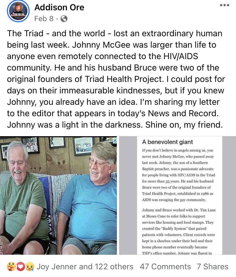 Johnny and Bruce were gentle giants who stood out in a crowd so I’m sure they were one of the first couples that we met. This blog post is about Johnny, but it is hard for me to type his name without Bruce’s. They were together for 36 years and I seemed to almost always say their name as one word – Johnnyandbruce. When you met them, you immediately felt comfortable – they were both softspoken and kind. And I would soon learn that they were tremendous advocates for people living with HIV/AIDS in the Triad. They were founding members of Triad Health Project (THP), a local AIDS service organization that continues to this day. THP’s main office number was originally Johnny and Bruce’s home phone number – just process that. Client records were kept securely in a shoebox under their bed and Johnny and Bruce were often surrogate family for people who had been abandoned by their own.
