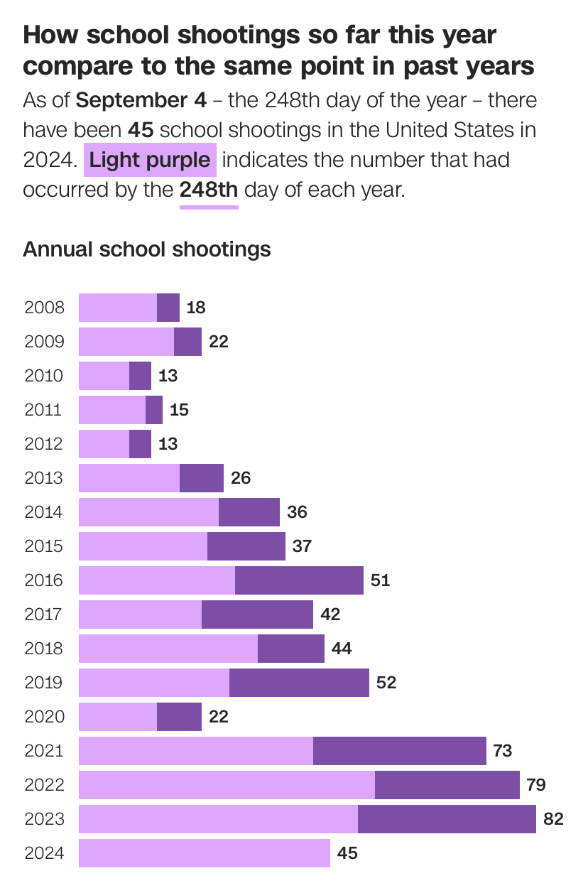 Poignant but unfortunately you are preaching to the choir. This is one of the reasons that this staunch advocate of public education helps pay for private school for her grandchildren. (363 shootings in public vs. 24 in private schools 1999-2023.)