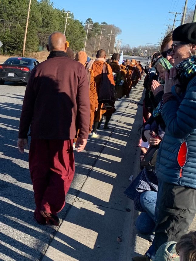 The monks passed through the Piedmont Triad – where I live – and were greeted like the rock stars they are. 10,000 people gathered at a stadium in High Point, NC to welcome them on a frigid morning. Hundreds of other folks lined the route as they made their way to Greensboro. The turnout to support the monks was amazing and even more remarkable was that none of those thousands of people behaved badly – at least from my vantage point.