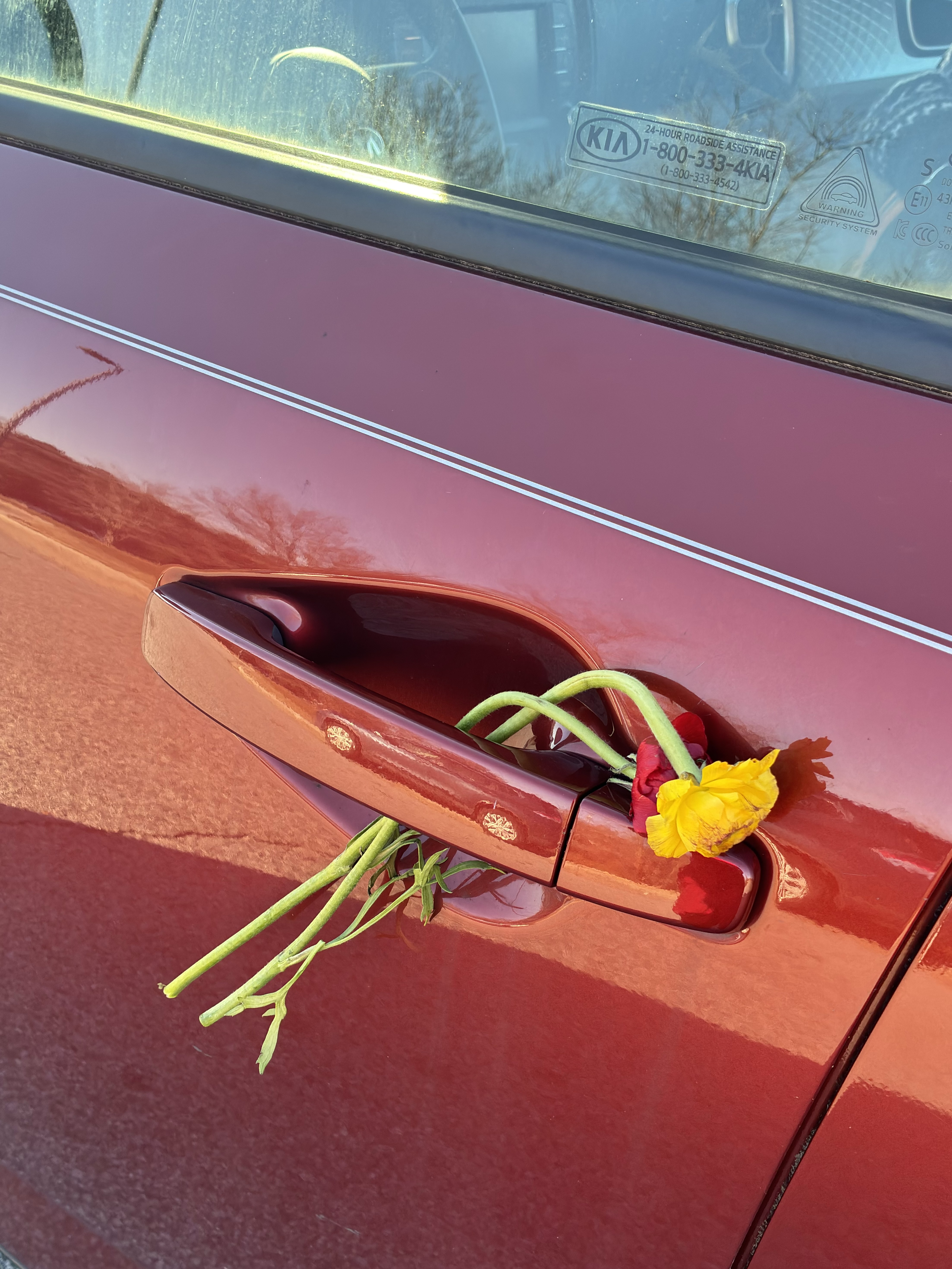 When we got back to our car, my wife found two little flowers stuck in the door handle of the driver’s side. They looked like the simple flowers that the monks carry. I bet they came from the little family that liked my stickers. They were a bit dilapidated from the cold, but still so bright and cheerful – downright resilient. Folks, sometimes the metaphors write themselves. And that’s how a humble band of monks lifted a weary community on their slight shoulders for a few glorious hours on a cold day in January.